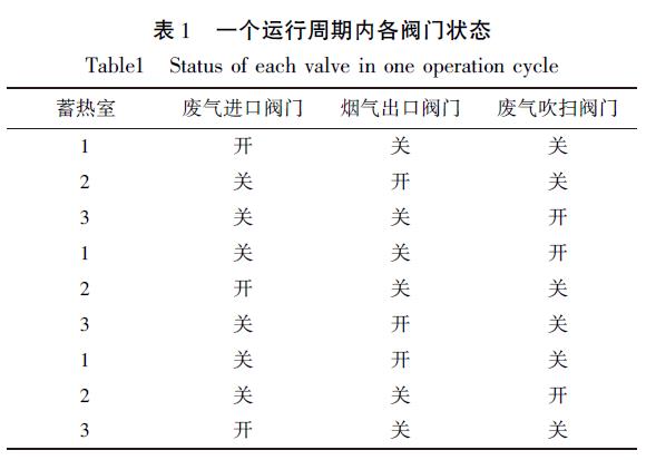 程因為是通過程序控制氣動調(diào)節(jié)閥工作, 能在短時間內(nèi)切換閥門狀態(tài), 保證三個蓄熱室一次完成蓄熱、放熱和吹掃的過程。在一個運行周期內(nèi)每個蓄熱室下的閥門切換狀態(tài)如表1 所示。