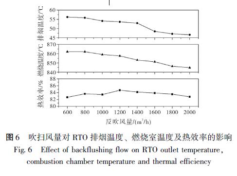 吹掃過程是通過吹掃風(fēng)機將殘留在蓄熱室內(nèi)的VOCs 帶入燃燒室, 以提高廢氣的效率[11] 。但目前RTO 反吹風(fēng)量的設(shè)計大多基于工程經(jīng)驗, 對不同工況下的實際運行參考性不高。為了研究吹掃風(fēng)量對RTO 裝置運行的影響, 試驗設(shè)定在廢氣流量8000 m3 / h, 切換時間2 min 且無電加熱的條件下, 模擬吹掃風(fēng)量從600 m3 / h 增加到2000 m3 / h 時出口溫度、燃燒室溫度和熱效率變化情況。如圖6 所示。由于吹掃風(fēng)是從排至煙囪的煙氣中抽取, 實際吹掃風(fēng)中含有的VOCs 濃度較低, 無法給燃燒室提供多的。同時, 過大的吹掃風(fēng)量增加了進入進氣和排氣蓄熱室的流量, 降低了實際發(fā)生氧化反應(yīng)的廢氣的預(yù)熱溫度, 且降低了出口溫度。雖然熱效率在1200 m3 / h 吹掃風(fēng)量附近有一定程度的增加, 但結(jié)合燃燒室溫度和經(jīng)濟因素,800 ~1000 m3 / h 區(qū)間內(nèi)較為合理與實際工程經(jīng)驗吹掃風(fēng)量占進氣流量的10% 左右結(jié)論相近[12] 。同時可以看出, 吹掃風(fēng)量越大, 燃燒室的溫度越低, 需要開啟電加熱器提供熱量來提高燃燒室的溫度, 增加運行成本。